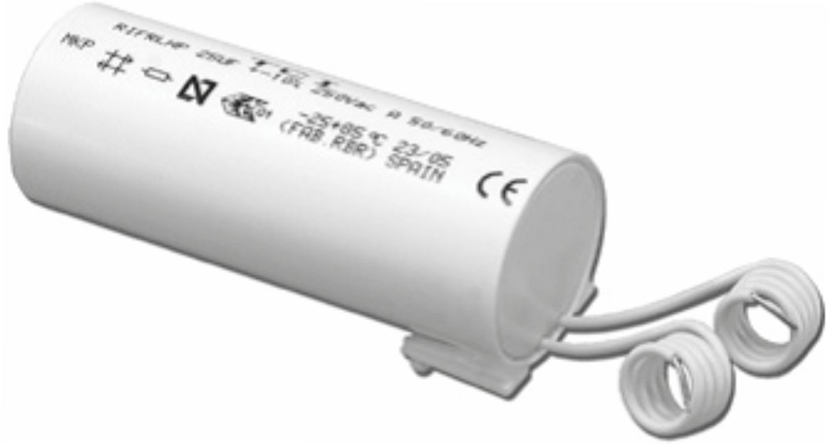 Condensadores de iluminación en carcasa de plástico con fijación por tornillo M8, tensión máx. 250 Vca. Condensadores de corrección del factor de potencia para iluminación. Conexión mediante cables suministrados con tuerca de fijación Condensadores para iluminación