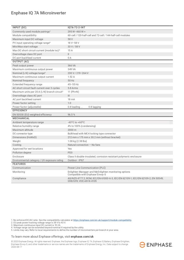 ENPHASE ENERGY IQ7A-72-2-INT MICRO INVERTER FOR 60- AND 72-CELL MODULES