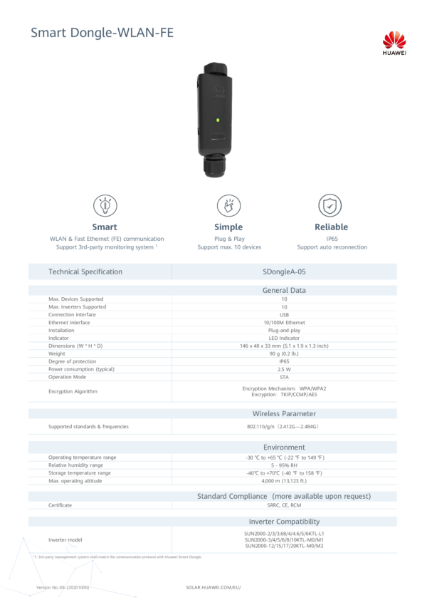 Sistema intelligente per il monitoraggio di inverter Huawei SUN2000 di nuova generazione, consente di connettere fino a 10 inverter. Display con indicatore a LED e IP65.