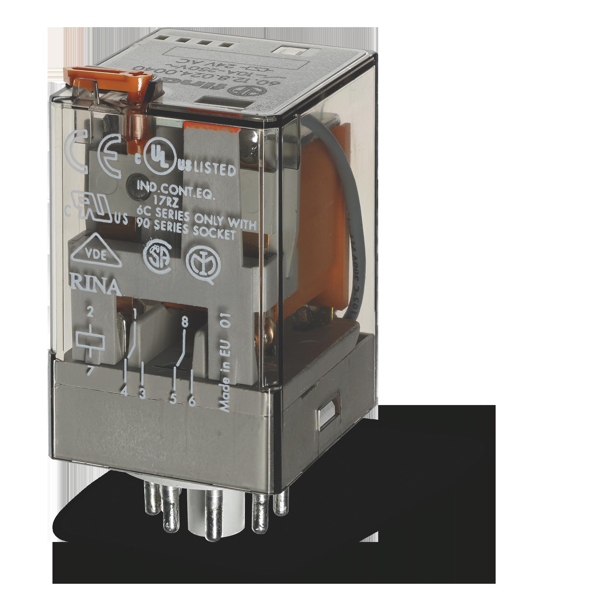 Rele’ industriale. (A): 10 N°contatti: 2 Configurazione contatti: CO Materiale contatti: AgNi Collegamento elettrico: raccordo a innesto Alimentazione: AC Volt AC: 12 V. non polarizzato monostabile Categoria di protezione: RT I. Optional: Pulsante di prova+indicatore meccanico Accessori: Zoccolo S.90 RELÈ INDUSTRIALE 2 CONTATTI 10A OCTAL