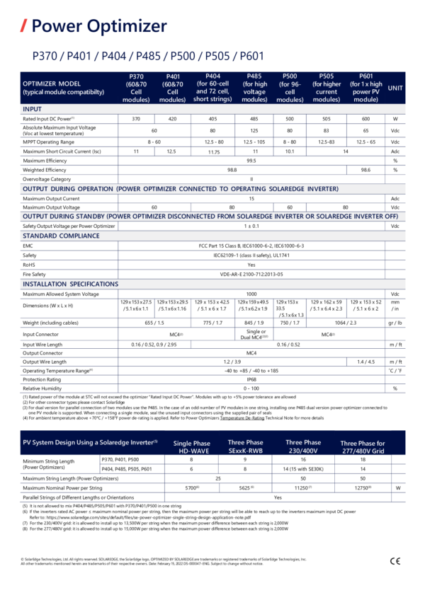 Ottimizzatore di potenza per funzionare con inverter SolarEdge e moduli con corrente più elevata – Specificamente progettato per funzionare con inverter SolarEdge – Fino al 25% di energia in più – Manutenzione di nuova generazione con monitoraggio a livello di modulo – Riduce tutti i tipi di perdita di mancata corrispondenza dei moduli, dalla tolleranza di produzione alla ombreggiatura parziale – Efficienza superiore (99,5%) – Design flessibile del sistema per il massimo utilizzo dello spazio – Spegnimento della tensione a livello di modulo per la sicurezza dell’installatore e dei vigili del fuoco – Installazione rapida con un solo bullone – Connettore di uscita: collegabile MC4 – Lunghezza del cavo di uscita: 1,2 m – Ingresso Lunghezza filo: 0,16 m