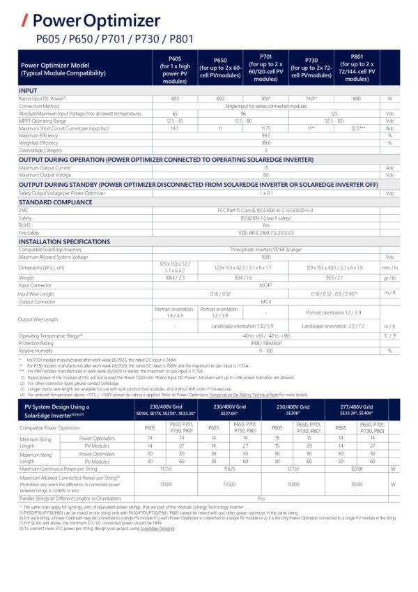 – Ottimizzatore di potenza per funzionare con inverter SolarEdge (SE25k e superiori)